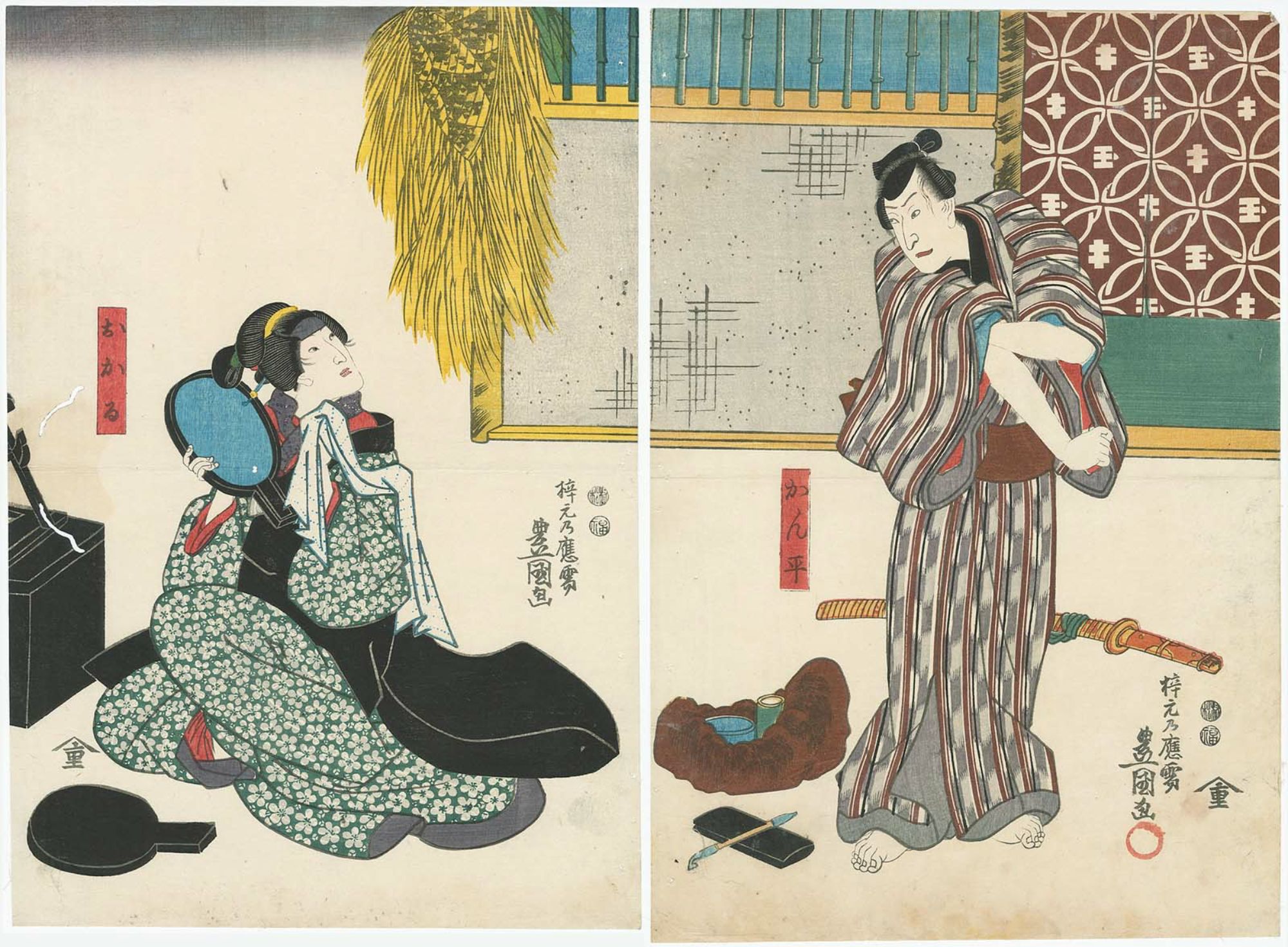 The left sheet of a diptych, featuring Bandō Hikosaburō V as Hayano Kanpei in Act VI of